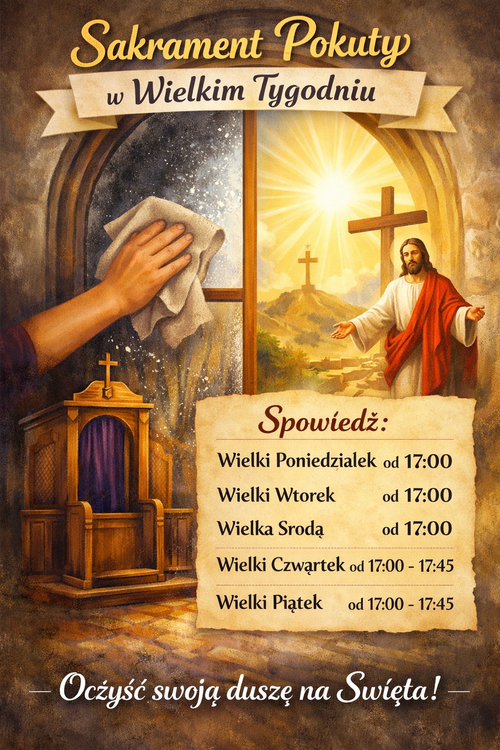 Często przed świętami czekamy na odpowiedni moment, by umyć okna i wpuścić do domu więcej światła. Jeszcze ważniejsze jest jednak, by oczyścić „okno” naszego sumienia w sakramencie pokuty, aby serce mogło napełnić się Bożym światłem i pokojem. Serdecznie zapraszamy do skorzystania z sakramentu pokuty i pojednania przed Uroczystością Zmartwychwstania Pańskiego