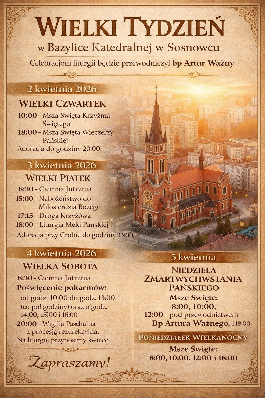 Zapraszamy do wspólnego przeżywania Wielkiego Tygodnia, a szczególnie Świętego Triduum Paschalnego. To wyjątkowy czas, w którym Kościół prowadzi nas przez najgłębsze tajemnice naszej wiary – od Wieczernika, przez Krzyż, aż po radość Zmartwychwstania. Liturgiom będzie przewodniczył Biskup Artur Ważny. Przyjdź i pozwól Bogu dotknąć Twojego serca. Zatrzymaj się, aby głębiej przeżyć miłość, która oddaje życie – i zwycięża śmierć.